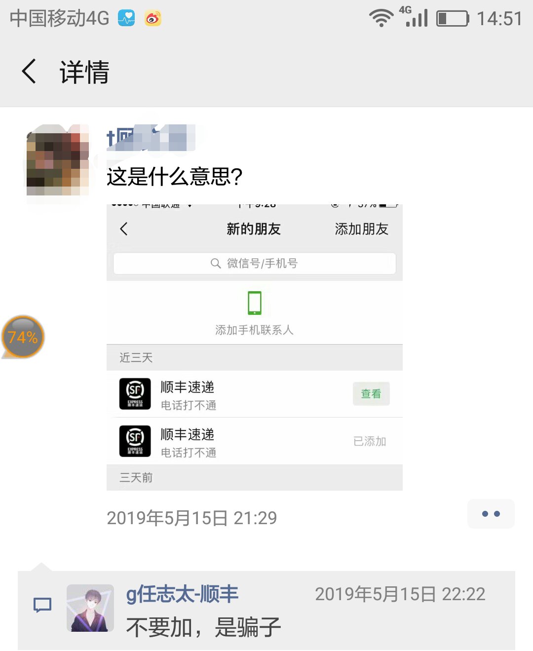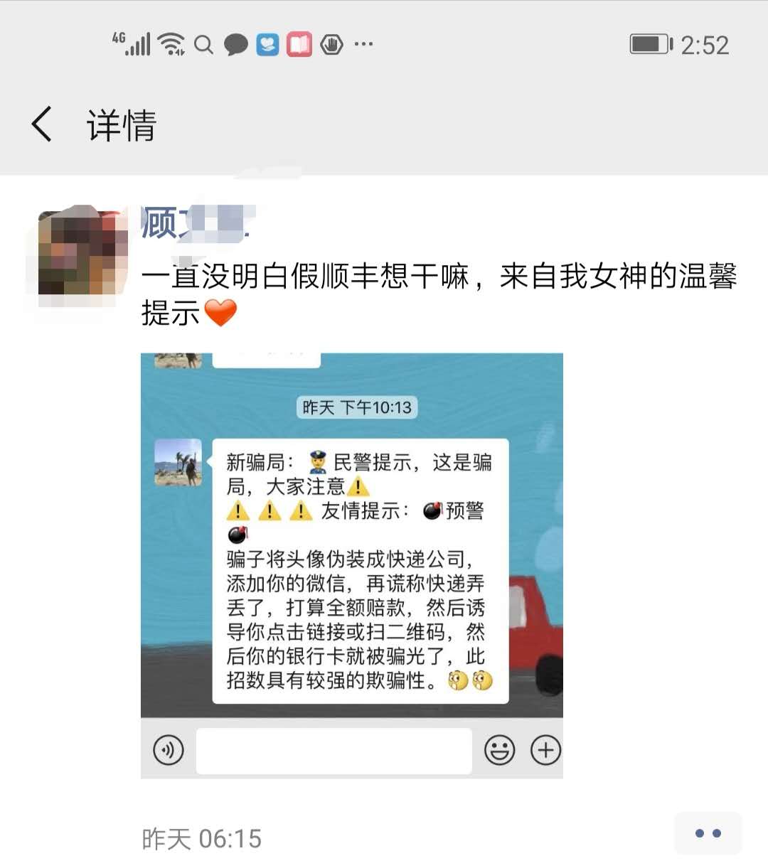 小顧是我們專(zhuān)門(mén)負(fù)責(zé)發(fā)貨的同事,公司很多貨都是通過(guò)順豐來(lái)寄給客戶(hù)的,前兩天小顧碰到了順豐加她微信號(hào)的事,小顧覺(jué)得很不正常,截圖發(fā)了萬(wàn)能的朋友圈,和我們對(duì)接的順豐人員評(píng)論說(shuō)是騙子,不要加。后來(lái)又有朋友提醒她騙子加她微信的目的,終于明白了假順豐的用意。假順豐正是利用大家對(duì)順豐的認(rèn)可和信任,來(lái)欺騙廣大的順豐客戶(hù),這種行為也給順豐造成了傷害。