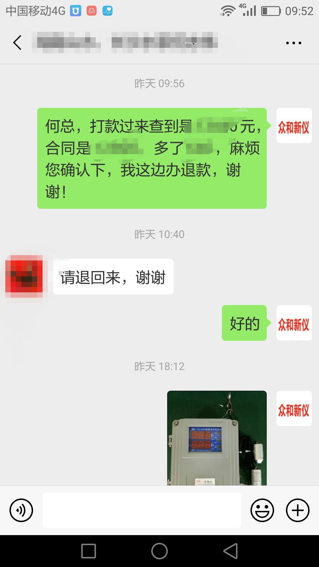 我第一時(shí)間把多付款的事情和具體金額,跟何總進(jìn)行了溝通,讓他那邊確認(rèn),何總過了約1小時(shí)后回復(fù)我了,讓我退款。