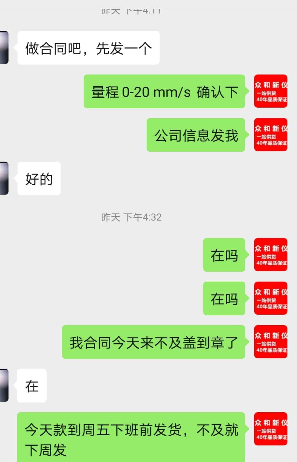 過了一會兒,客戶通知我做1臺CZJ-B3振動烈度監(jiān)視儀合同,我跟客戶講量程0-20 mm/s要確認(rèn),讓他把公司信息發(fā)我,我做合同要用。提醒客戶當(dāng)天付款周五可發(fā),如果不急下周發(fā),客戶說下周發(fā)太晚了,希望周五發(fā)貨,我建議客戶當(dāng)天打款??蛻赳R上把公司詳細(xì)信息發(fā)我做合同,量程他在確認(rèn)。我把公司的匯款信息發(fā)給他,提醒他匯完款拍個底單我,如果客戶有匯錯的情況發(fā)生,我能先核對下,以免到賬款晚了影響發(fā)貨,這種匯錯的情況還是有的。一會客戶對我說匯款賬號不對,又退回了,我肯定地回復(fù),給他的匯款信息是沒有問題的,讓他仔細(xì)看下信息。幾分鐘后客戶把匯款底單拍我了,我核對后沒有問題,隨后量程也確認(rèn)到了給我,我把合同做好了,等明天蓋章后發(fā)客戶,當(dāng)天下班時(shí)間到了,已來不及走流程。