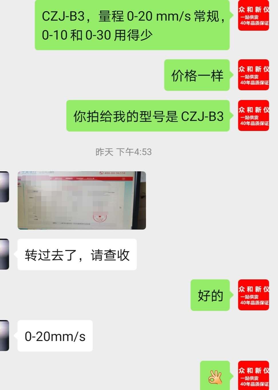 以上CZJ-B3振動烈度監(jiān)視儀的來回溝通就是我們的工作日常,通過溝通了解客戶的需求,確認(rèn)關(guān)鍵信息,如型號、參數(shù)、價(jià)格、貨期、收貨信息、發(fā)票等,一一和客戶確認(rèn),簽合同。該客戶比較爽快,我跟他講了貨期后沒等合同傳給他,就先付款了,感謝信任,跟這樣的客戶合作效率比較高。該客戶只訂了CZJ-B3振動烈度監(jiān)視儀,并沒有訂配套的振動傳感器,常規(guī)配SZ-6磁電式速度傳感器,CZJ-B3振動烈度監(jiān)視儀是雙道振動儀表,一臺可配2只SZ-6磁電式速度傳感器。
