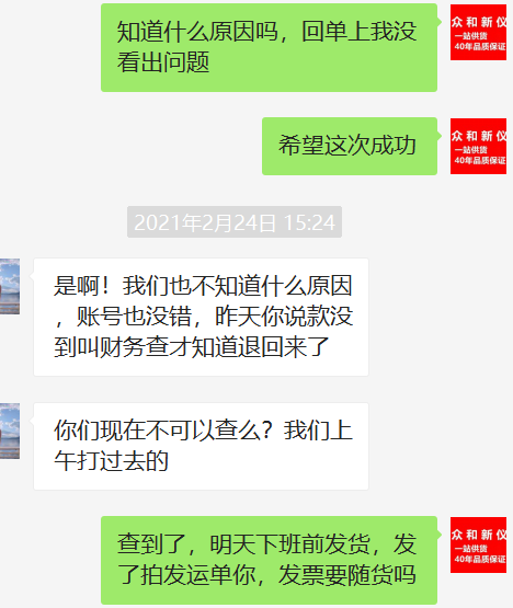前幾天有個廣西中間商購買我們江陰眾和的SZC-04B智能轉(zhuǎn)速表的客戶,知道是急要貨的,所以我關(guān)注著,客戶也把付款單拍我了,我看也沒有問題正確,等到財務(wù)賬單打印出來,沒有收到款,客戶查了才看到款退回去了,重新付款后終于確認(rèn)到賬,后來時間太緊讓我們把貨直發(fā)用戶了。最終原因,也沒明白。